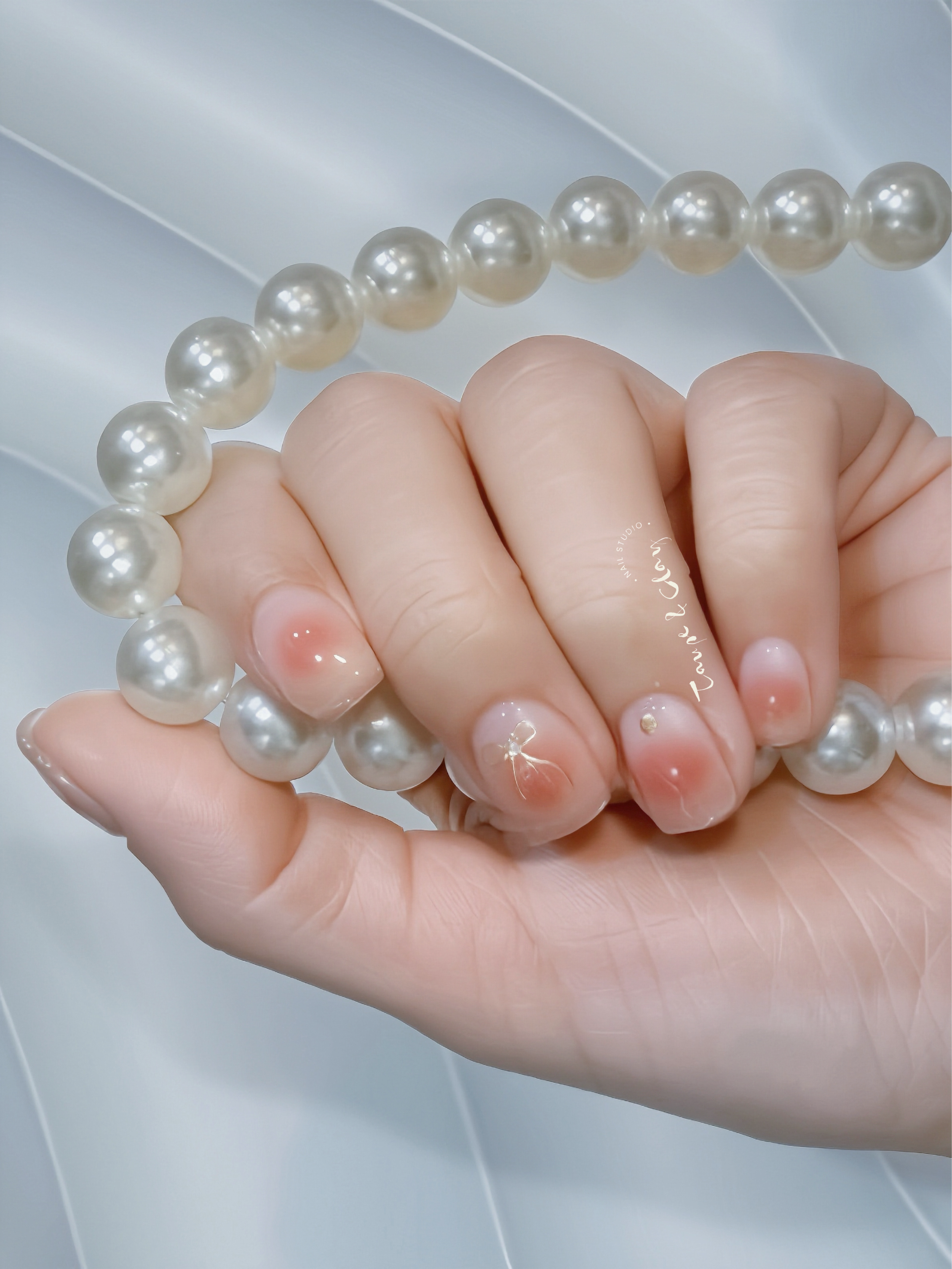 เล็บต่อเจลใสพอดีปลายนิ้วเป็นพื้นเงาสวยให้กับสีเพ้นท์โทนพีชและลายตกแต่งสีทอง
